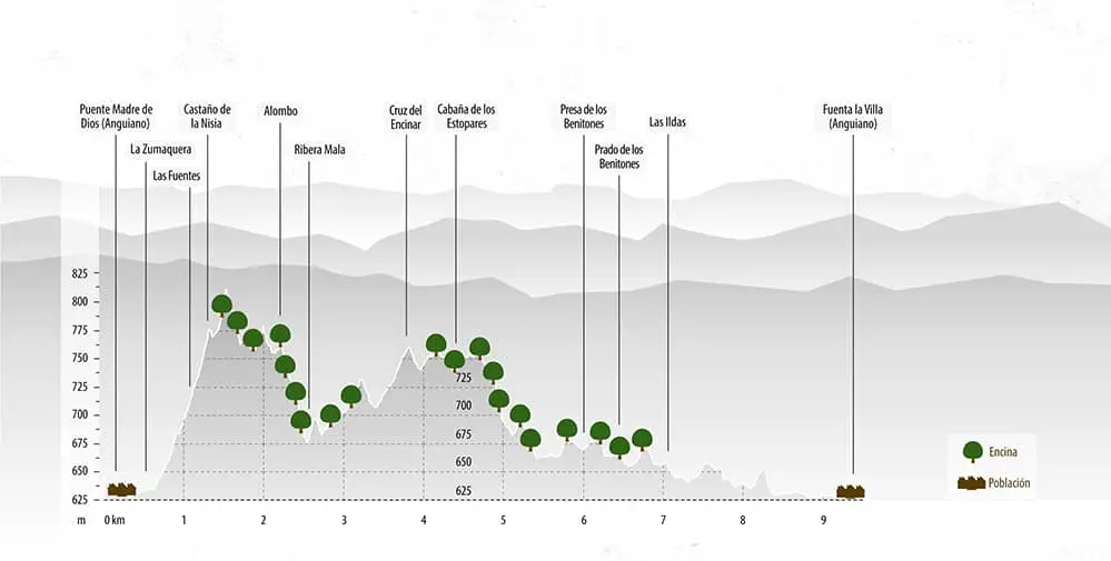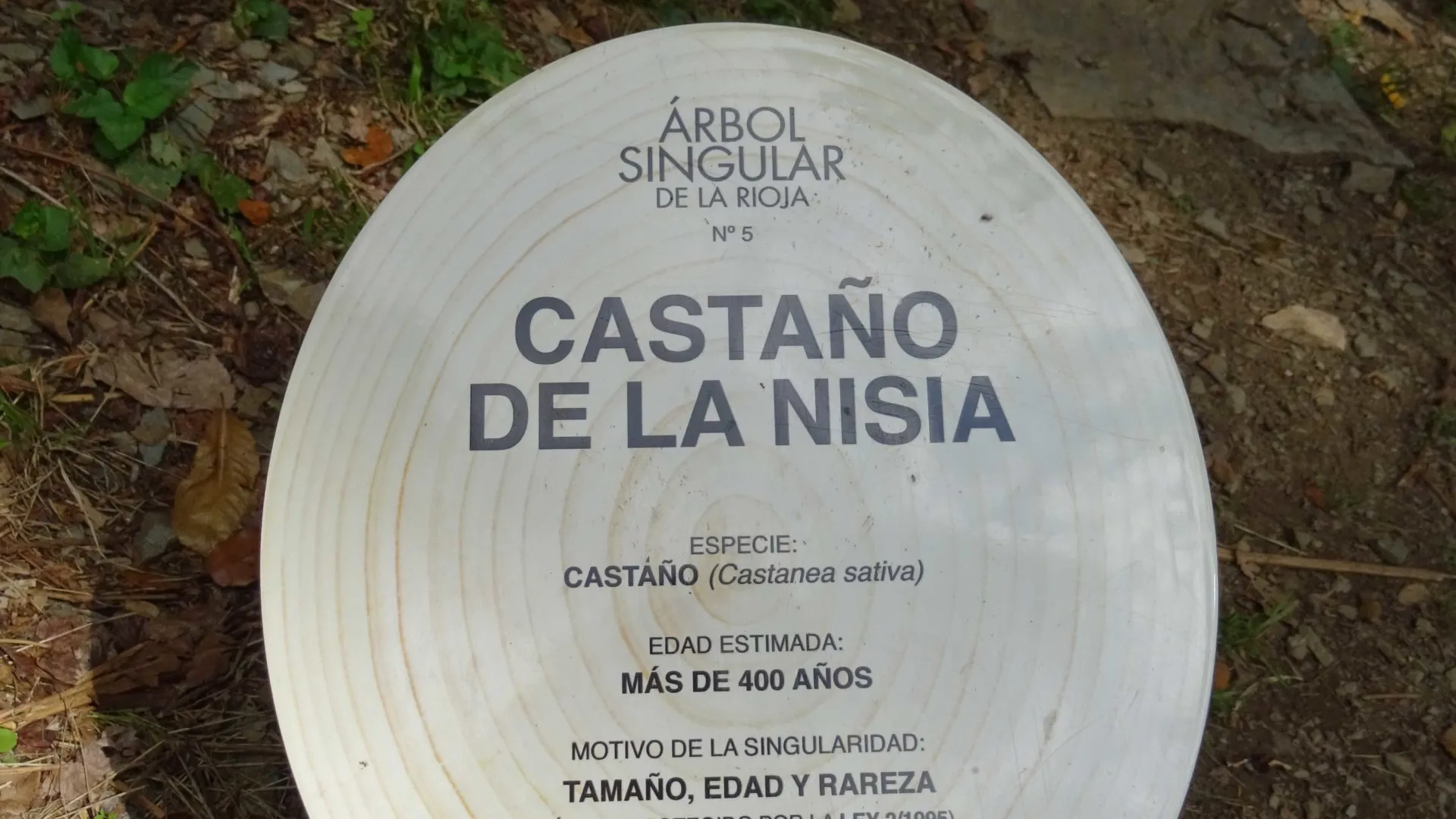 El recorrido se inicia junto al panel informativo existente en la zona de aparcamiento junto al Puente de Madre de Dios. Se cruza el puente y por el Barrio de Cuevas salimos del casco urbano de Anguiano. Al dejar atrás las últimas casas avanzamos por un sendero hacia el Castaño de la Nisia.