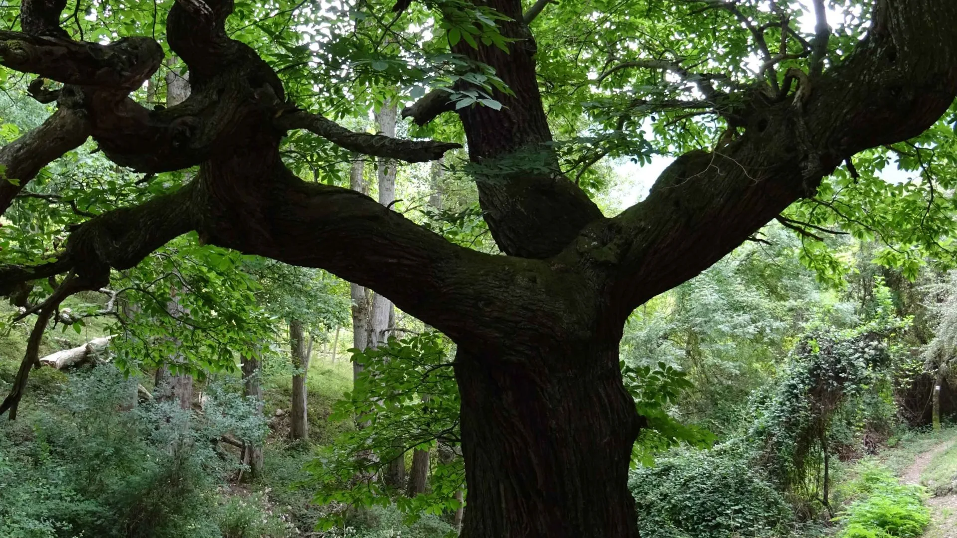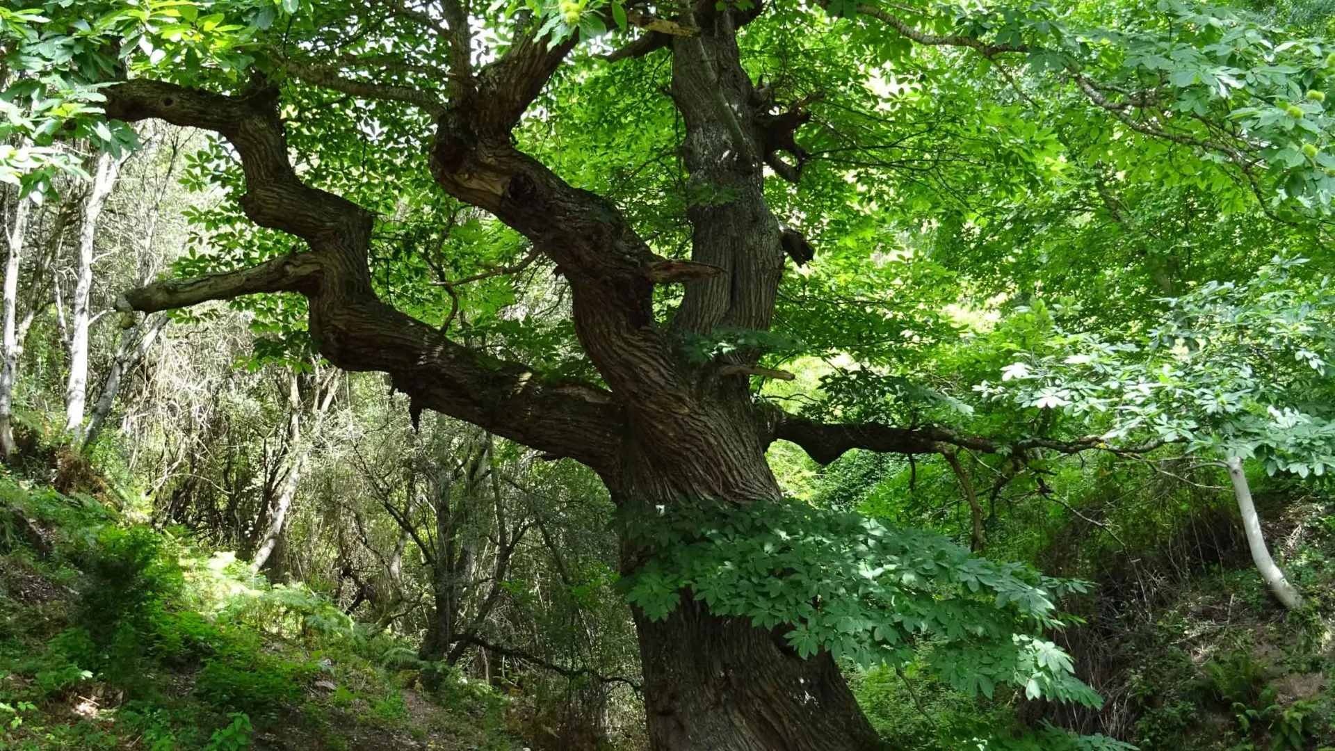 Llegamos al Castaño de la Nisia, árbol singular de espectacular porte que supera los 400 años. Desde aquà continuamos por la senda de las encinas, atravesando un denso encinar, especie que da identidad propia a este itinerario. Llegando a intersección con la ruta 2 y 3 que continúan hacia la derecha y nuestra ruta que sigue de frente en descenso.